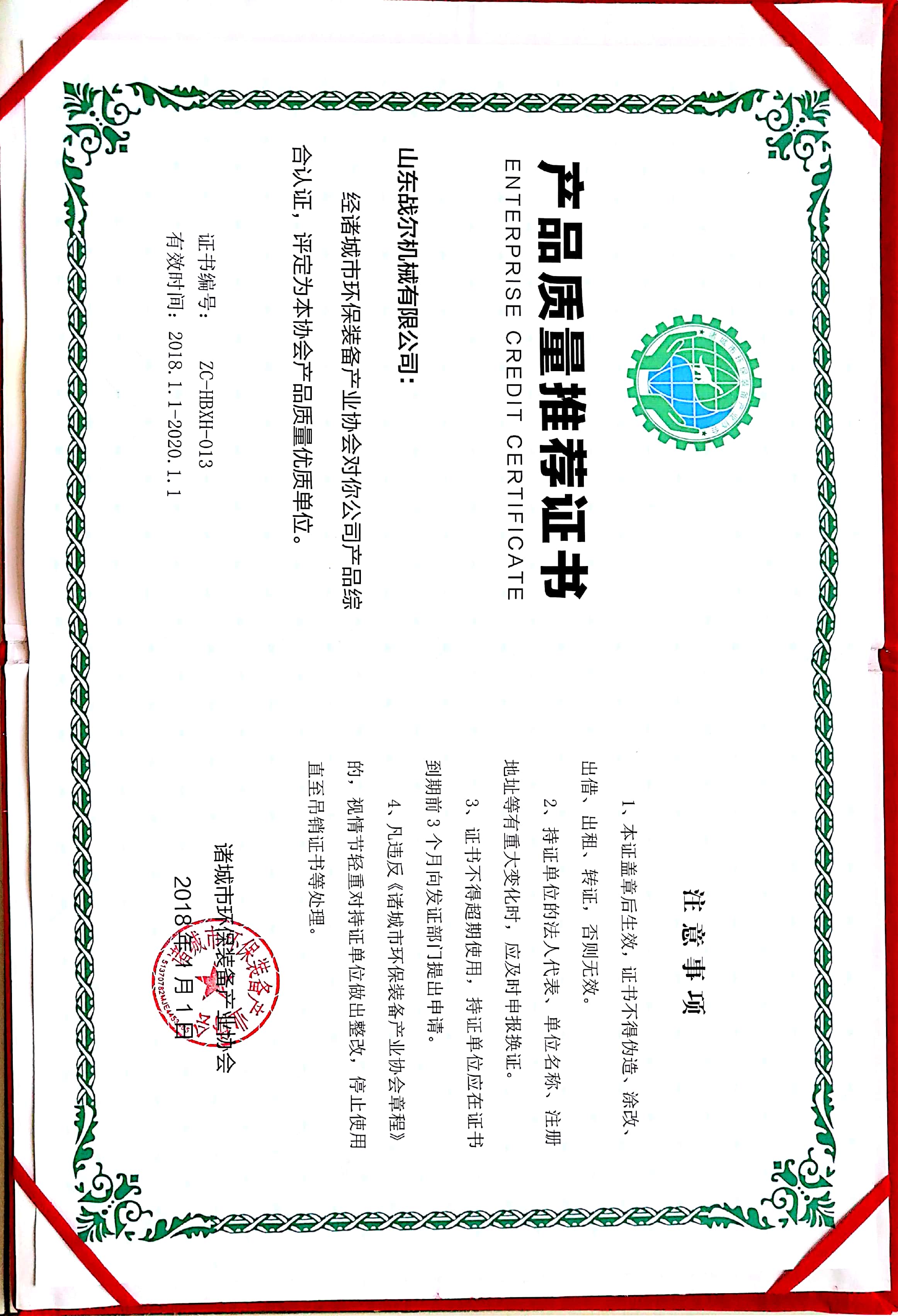 • 环保产业装备证书