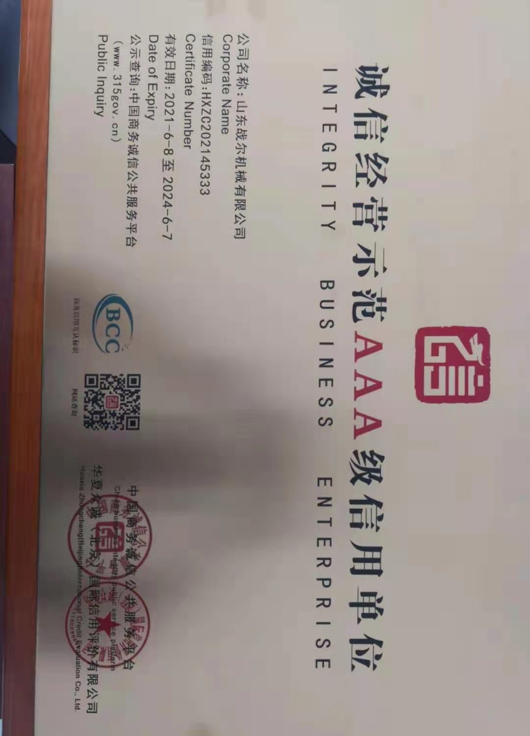 • 重合同守信用AAA级信用企业